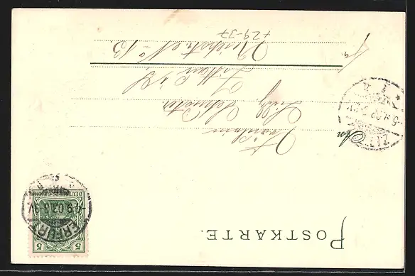 Personenbezogene Daten auf der Rückseite der Karte wurden durch blauen Textmarker unkenntlich gemacht. Die blauen Stellen sind auf die Vorderseite durchgeweicht und wirken sich negativ auf das Postkartenfoto aus
