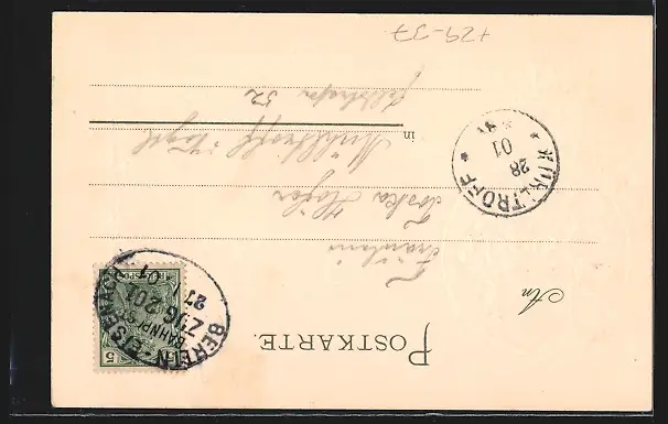 Personenbezogene Daten auf der Rückseite der Karte wurden durch blauen Textmarker unkenntlich gemacht. Die blauen Stellen sind auf die Vorderseite durchgeweicht und wirken sich negativ auf das Postkartenfoto aus