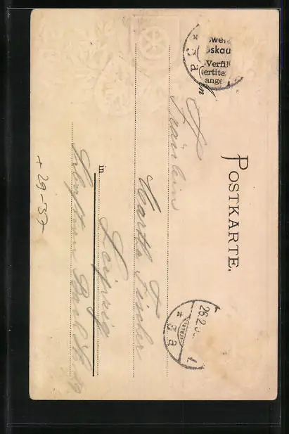 Personenbezogene Daten auf der Rückseite der Karte wurden durch blauen Textmarker unkenntlich gemacht. Die blauen Stellen sind auf die Vorderseite durchgeweicht und wirken sich negativ auf das Postkartenfoto aus