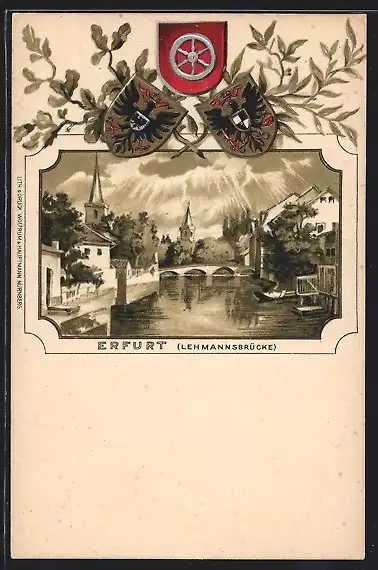 Passepartout-Lithographie Erfurt, Lehmannsbrücke mit Wappen