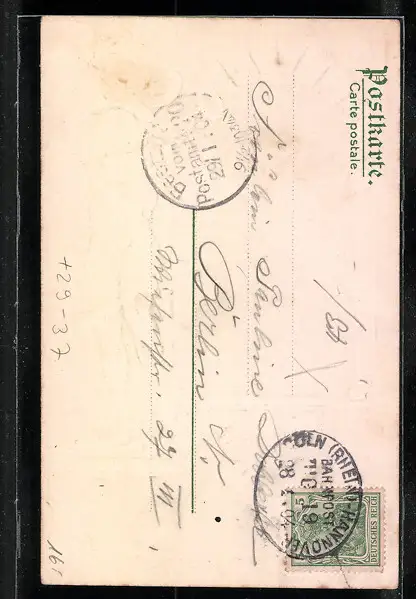 Personenbezogene Daten auf der Rückseite der Karte wurden durch blauen Textmarker unkenntlich gemacht. Die blauen Stellen sind auf die Vorderseite durchgeweicht und wirken sich negativ auf das Postkartenfoto aus