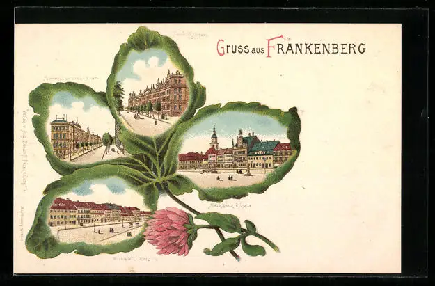 Passepartout-Lithographie Frankenberg, Marktplatz, Humboldstrasse, Kleeblatt