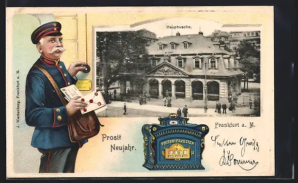 Passepartout-Lithographie Frankfurt, Ansicht der Hauptwache, Briefträger mit Neujahrsgrüssen