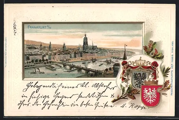 Passepartout-Lithographie Frankfurt, Dampfer, Ortspartie, Wappen