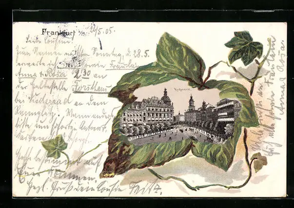 Passepartout-Lithographie Frankfurt /Main, Ansicht vom Rossmarkt auf Efeublatt