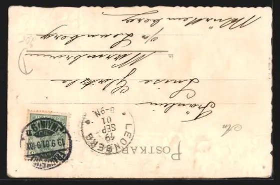 Personenbezogene Daten auf der Rückseite der Karte wurden durch blauen Textmarker unkenntlich gemacht. Die blauen Stellen sind auf die Vorderseite durchgeweicht und wirken sich negativ auf das Postkartenfoto aus