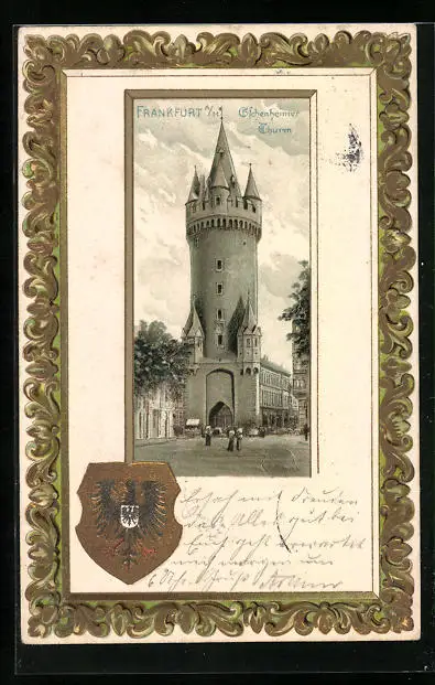 Passepartout-Lithographie Frankfurt /Main, Partie am Eschenheimer Thurm mit Wappen