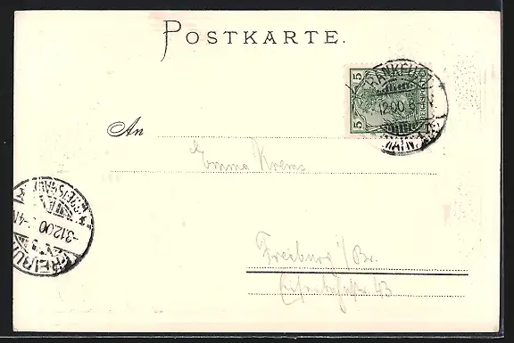 Personenbezogene Daten auf der Rückseite der Karte wurden durch blauen Textmarker unkenntlich gemacht. Die blauen Stellen sind auf die Vorderseite durchgeweicht und wirken sich negativ auf das Postkartenfoto aus