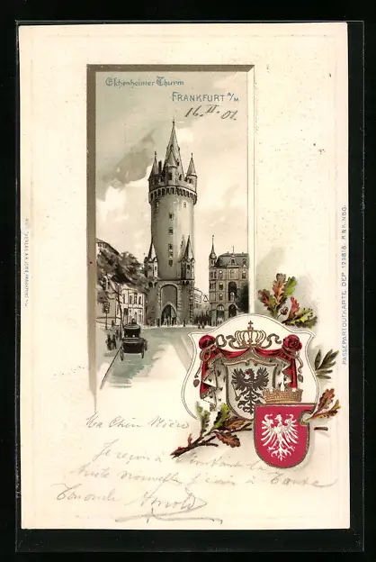 Passepartout-Lithographie Frankfurt /Main, Strassenpartie am Eschenheimer Thurm, Wappen