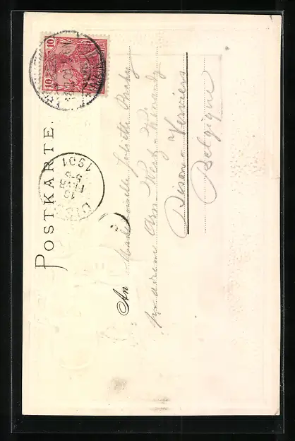 Personenbezogene Daten auf der Rückseite der Karte wurden durch blauen Textmarker unkenntlich gemacht. Die blauen Stellen sind auf die Vorderseite durchgeweicht und wirken sich negativ auf das Postkartenfoto aus