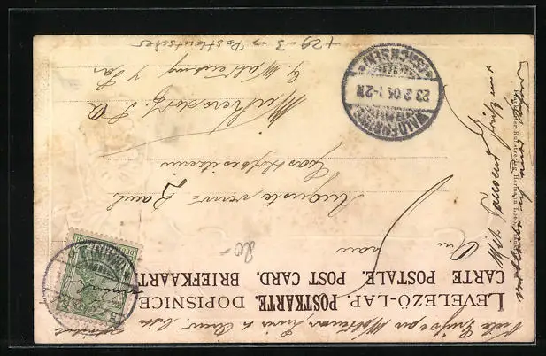 Personenbezogene Daten auf der Rückseite der Karte wurden durch blauen Textmarker unkenntlich gemacht. Die blauen Stellen sind auf die Vorderseite durchgeweicht und wirken sich negativ auf das Postkartenfoto aus