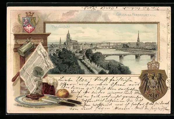 Passepartout-Lithographie Frankfurt a. M., Totalansicht, Wappen