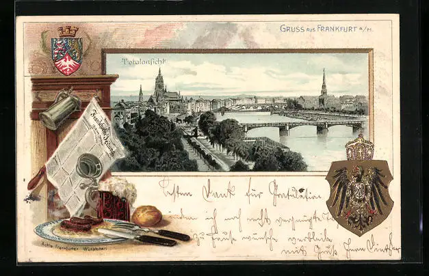Passepartout-Lithographie Frankfurt a. M., Totalansicht mit Wappen