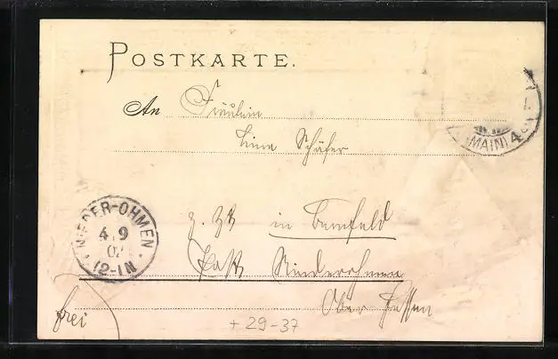 gelaufen 1902, Briefmarke entfernt, rückseitig Klebe- und Papierreste, guter Zustand