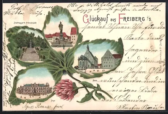 Passepartout-Lithographie Freiberg i. S., Marktbrunnen, Freitreppe, Post u. Dom im Kleeblatt