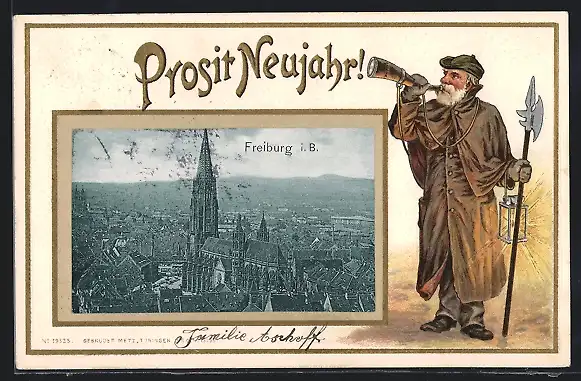 Passepartout-Lithographie Freiburg i. B., Münster, Nachtwächter wünscht Prosit Neujahr