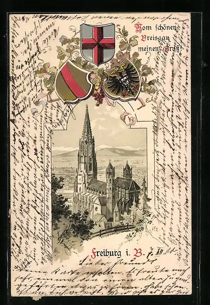 Passepartout-Lithographie Freiburg i. B., Münster von oben, Stadtwappen