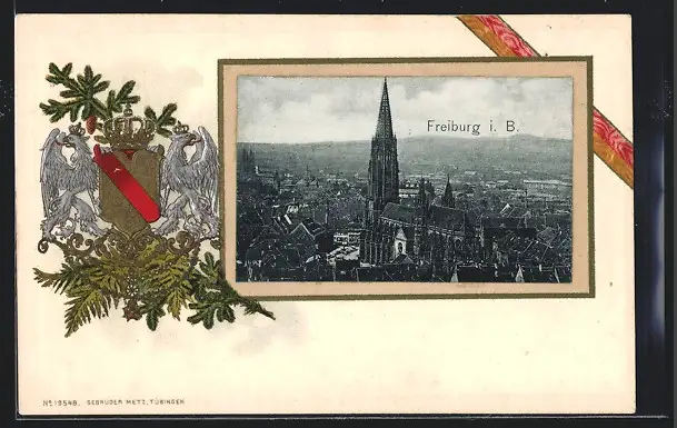 Passepartout-Lithographie Freiburg i. B., Ortsansicht mit Kirche, Wappen