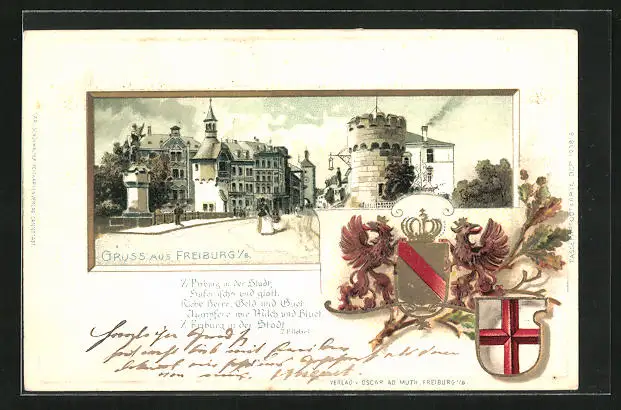 Passepartout-Lithographie Freiburg i. B., Strassenpartie mit Turm, Wappen