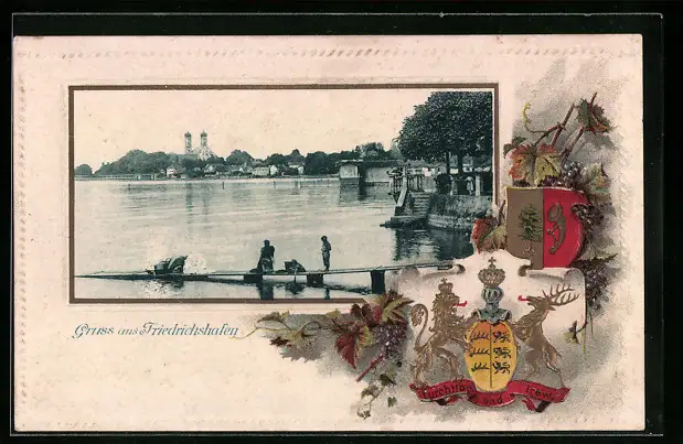 Passepartout-Lithographie Friedrichshafen, Ortsansicht mit Bodensee