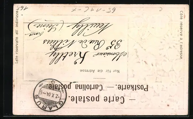 Personenbezogene Daten auf der Rückseite der Karte wurden durch blauen Textmarker unkenntlich gemacht. Die blauen Stellen sind auf die Vorderseite durchgeweicht und wirken sich negativ auf das Postkartenfoto aus