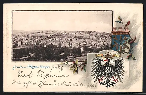 Passepartout-Lithographie Hagen, Totale mit Wappen