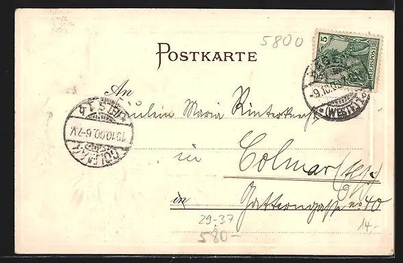 Personenbezogene Daten auf der Rückseite der Karte wurden durch blauen Textmarker unkenntlich gemacht. Die blauen Stellen sind auf die Vorderseite durchgeweicht und wirken sich negativ auf das Postkartenfoto aus