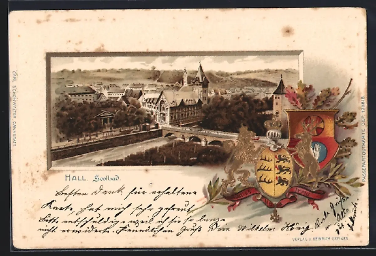 Passepartout-Lithographie Hall, Soolbad, Wappen