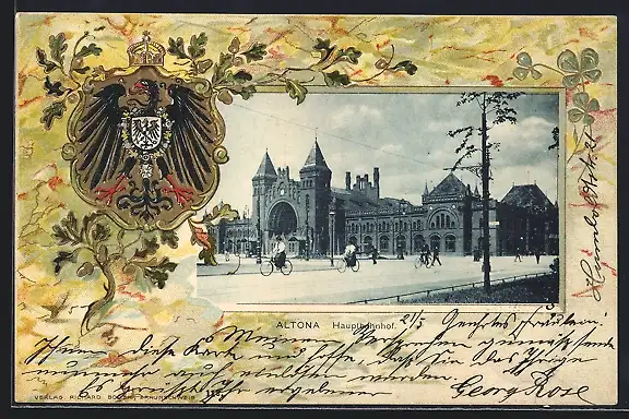 Passepartout-Lithographie Hamburg-Altona, Partie am Hauptbahnhof, Wappen mit Eichenzweig