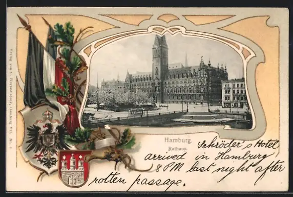 Passepartout-Lithographie Hamburg, Blick zum Rathaus, Wappen