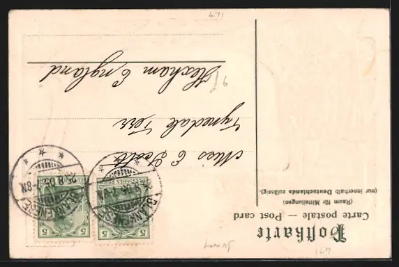 Personenbezogene Daten auf der Rückseite der Karte wurden durch blauen Textmarker unkenntlich gemacht. Die blauen Stellen sind auf die Vorderseite durchgeweicht und wirken sich negativ auf das Postkartenfoto aus