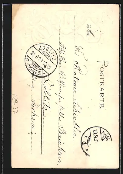 Personenbezogene Daten auf der Rückseite der Karte wurden durch blauen Textmarker unkenntlich gemacht. Die blauen Stellen sind auf die Vorderseite durchgeweicht und wirken sich negativ auf das Postkartenfoto aus