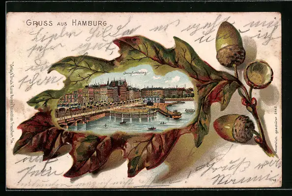 Passepartout-Lithographie Hamburg-Neustadt, Ansicht Jungfernstieg im Eichenblatt