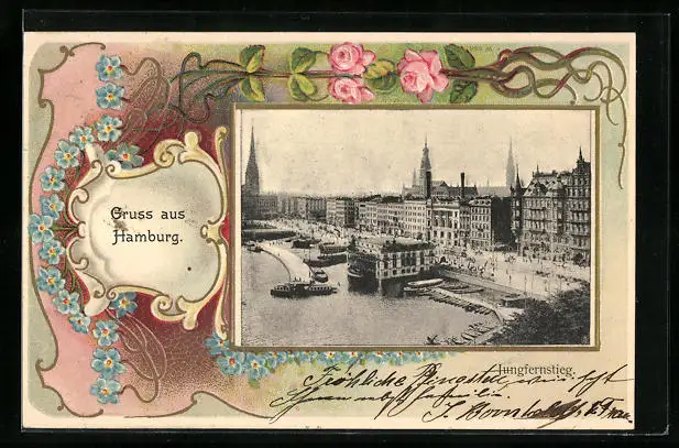Passepartout-Lithographie Hamburg-Neustadt, Jungfernstieg aus der Vogelschau, Blumengirlanden