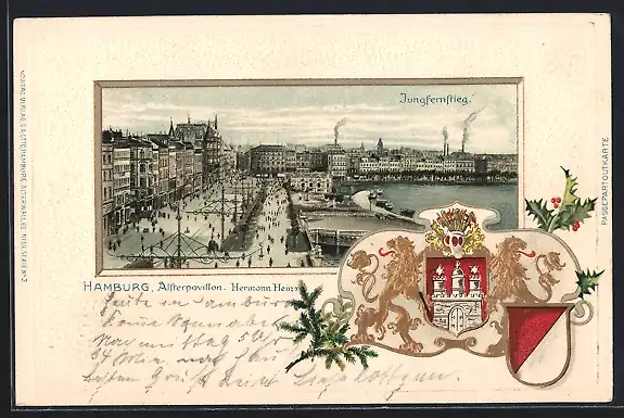 Passepartout-Lithographie Hamburg-Neustadt, Jungfernstieg, goldene Löwen mit Wappen
