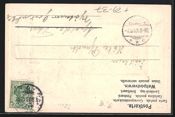 Personenbezogene Daten auf der Rückseite der Karte wurden durch blauen Textmarker unkenntlich gemacht. Die blauen Stellen sind auf die Vorderseite durchgeweicht und wirken sich negativ auf das Postkartenfoto aus