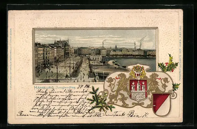 Passepartout-Lithographie Hamburg-Neustadt, Jungfernstieg mit Booten, Wappen