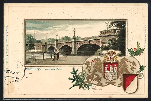 Passepartout-Lithographie Hamburg-Neustadt, Ortspartie an der Lombardsbrücke, Wappen