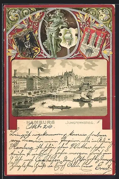 Passepartout-Lithographie Hamburg-Neustadt, Partie am Jungfernsteg, Wappen