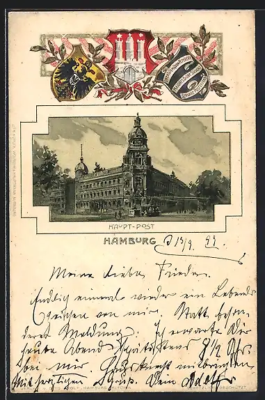 Passepartout-Lithographie Hamburg-Neustadt, Partie an der Hauptpost, Wappen und Lorbeerzweig