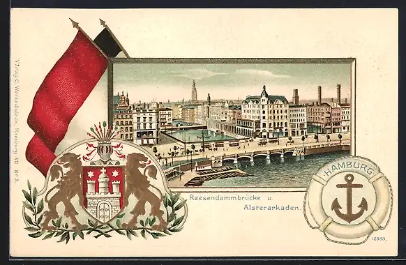 Passepartout-Lithographie Hamburg, Reesendammbrücke und Alsterarkaden, Wappen
