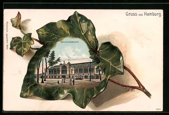 Passepartout-Lithographie Hamburg-Rotherbaum, Dammtorbahnhof im Weinblatt