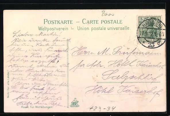 Personenbezogene Daten auf der Rückseite der Karte wurden durch blauen Textmarker unkenntlich gemacht. Die blauen Stellen sind auf die Vorderseite durchgeweicht und wirken sich negativ auf das Postkartenfoto aus