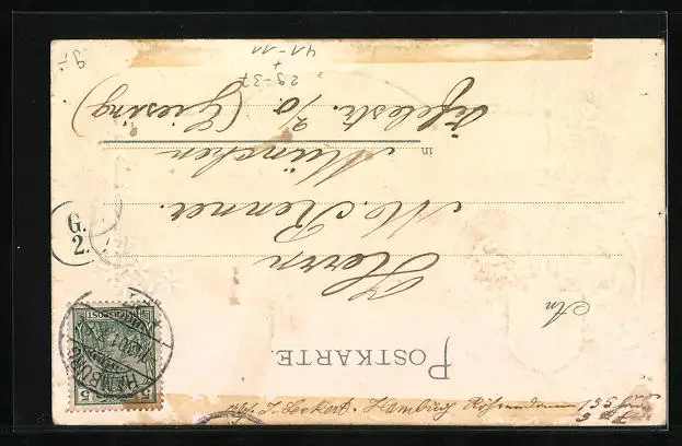 Personenbezogene Daten auf der Rückseite der Karte wurden durch blauen Textmarker unkenntlich gemacht. Die blauen Stellen sind auf die Vorderseite durchgeweicht und wirken sich negativ auf das Postkartenfoto aus