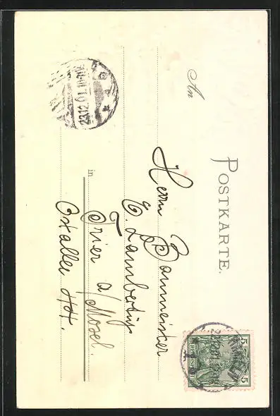 Personenbezogene Daten auf der Rückseite der Karte wurden durch blauen Textmarker unkenntlich gemacht. Die blauen Stellen sind auf die Vorderseite durchgeweicht und wirken sich negativ auf das Postkartenfoto aus