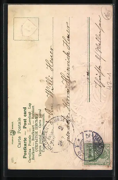 Personenbezogene Daten auf der Rückseite der Karte wurden durch blauen Textmarker unkenntlich gemacht. Die blauen Stellen sind auf die Vorderseite durchgeweicht und wirken sich negativ auf das Postkartenfoto aus