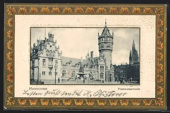 Passepartout-Lithographie Hannover, Partie an der Flusswasserkunst, Florale Ornamente