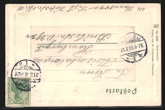 Personenbezogene Daten auf der Rückseite der Karte wurden durch blauen Textmarker unkenntlich gemacht. Die blauen Stellen sind auf die Vorderseite durchgeweicht und wirken sich negativ auf das Postkartenfoto aus