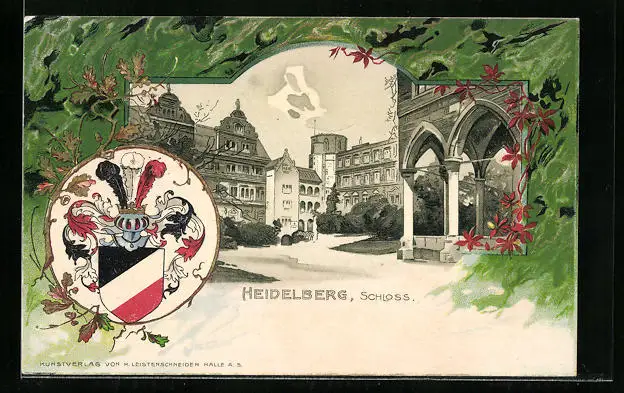 Passepartout-Lithographie Heidelberg, Schloss, Ritterhelm & Wappen
