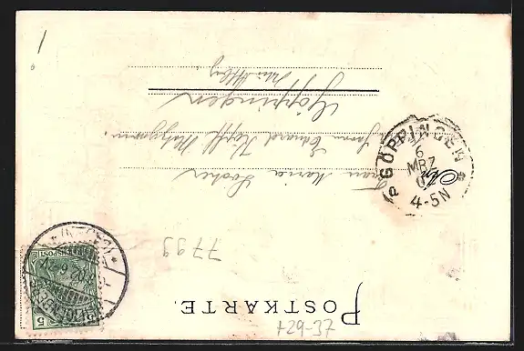 Personenbezogene Daten auf der Rückseite der Karte wurden durch blauen Textmarker unkenntlich gemacht. Die blauen Stellen sind auf die Vorderseite durchgeweicht und wirken sich negativ auf das Postkartenfoto aus